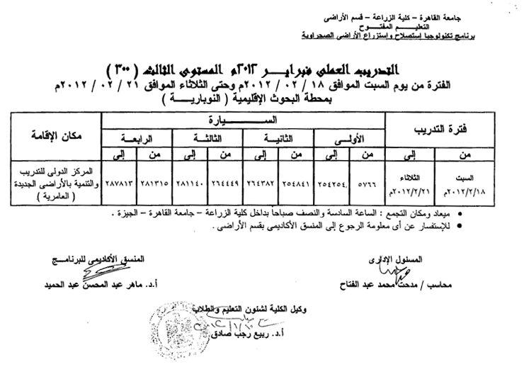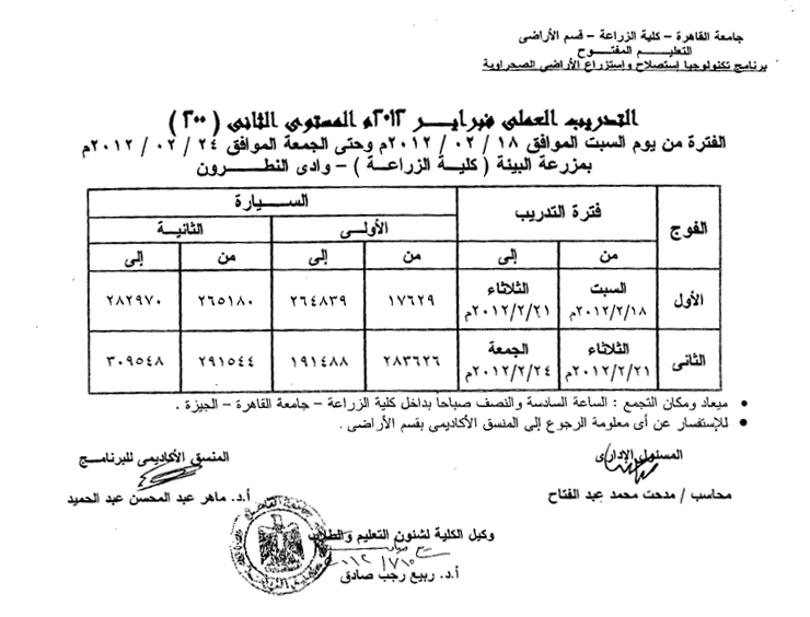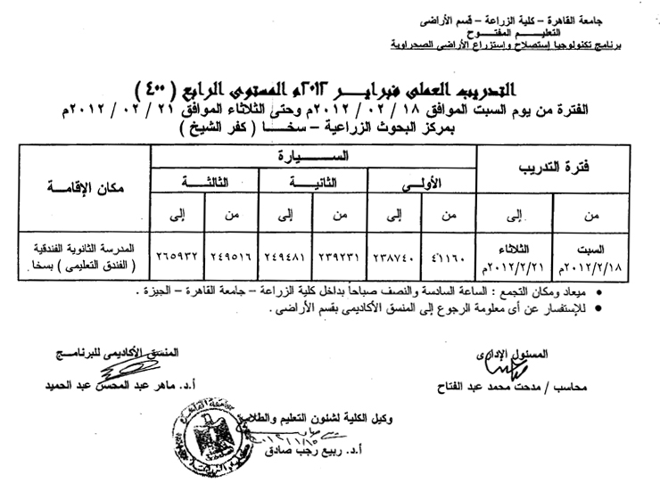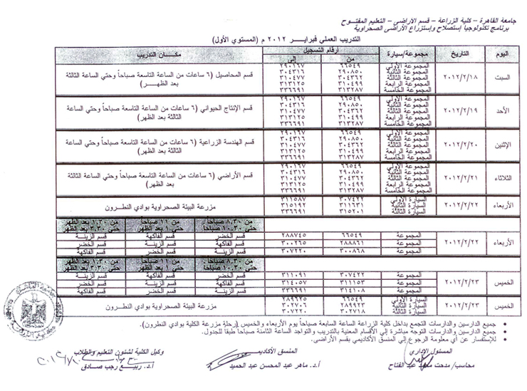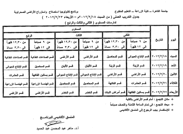 جداول التدريب العملي بكلية الزراعة دور فبراير 2012