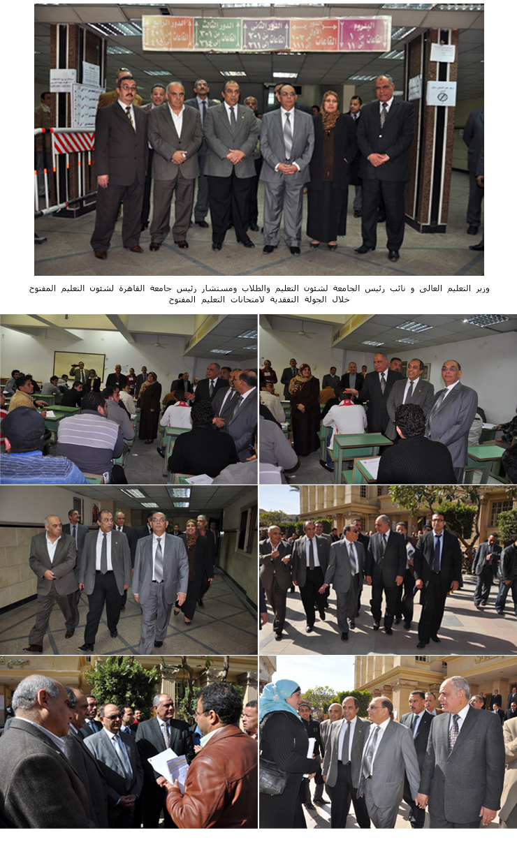 فى اطار الجولات التفقدية للسيد الاستاذ الدكتور حسين خالد وزير التعليم العالى لامتحانات مركز جامعة القاهرة للتعليم المفتوح ،قام سيادته صباح السبت 11 من فبراير الجارى برفقة كل من الاستاذ الدكتور عز الدين عمر ابو ستيت نائب رئيس الجامعة لشئون التعليم والطلاب والاستاذ الدكتور عادل مبروك مستشار رئيس جامعة القاهرة للتعليم المفتوح وكوكبة من اساتذة الجامعة وقياداتها بمتابعة سير عملية امتحانات التعليم المفتوح دور يناير 2012 بمجمع قاعات الامتحانات بالحرم الجامعى ، حيث قام سيادته والمرافقين له بالمرور على لجان الامتحانات حيث اطمأن على توافر كافة سبل الراحة والهدوء للدارسين وأن عملية الامتحانات تتم فى جو مثالى.